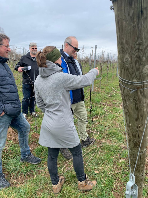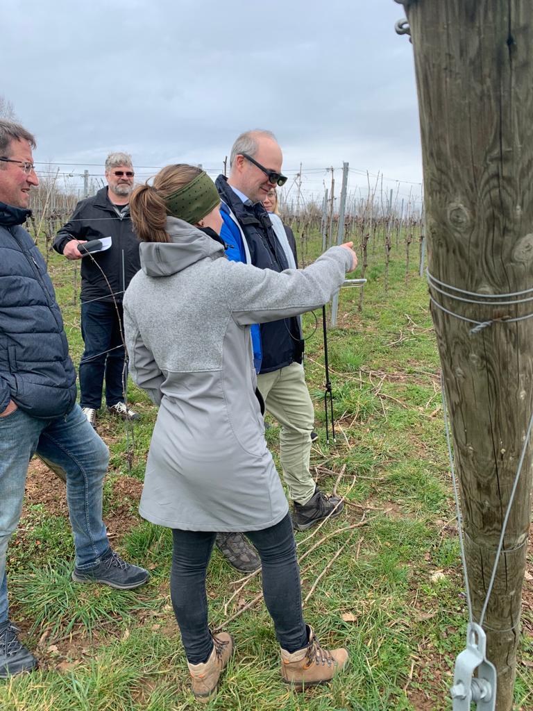 (02.05.2023) Zur Vorstellung und Evaluierung des aktuellen Prototyps gab es zum Ende der vergangenen Schnittsaison verschiedene Treffen im Weinberg. Zum einen fanden Einführungen in das System für die Winzer der OG statt, welchen anschließend Prototypen und Evaluierungsbögen übergeben wurden. Damit konnten Tests und Bewertungen in den Versuchsflächen durchgeführt werden. Zum anderen wurde der aktuelle Entwicklungsstand Vertretern der ADD bei einem Treffen Ende März präsentiert. Die Ergebnisse der Evaluierung und das Feedback der Winzer werden nun ausgewertet und fließen in die finale Version des Prototyps ein, welche in den nächsten und damit letzten Monaten Projektlaufzeit entwickelt wird.