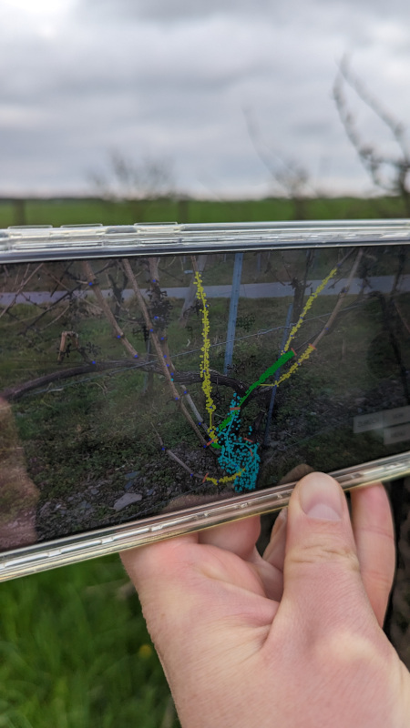(06.06.2023) In der mobilen KI-Rebschnitt App kann man sich über das Live-Tracking Schnittpositionen in Echtzeit anzeigen lassen. Nach erfolgreicher Initialisierung des Tracking stehen drei verschiedene Visualisierungen zur Auswahl. Die Standard-Visualisierung zeigt die Überlagerung vom abstrakten Graphmodell auf dem Rebstock an. Alternativ können auch Fruchtruten (in blau) und Zapfen (in rot) angezeigt werden. Bei dieser Visualisierung werden zusätzlich alternative Fruchtruten in lila angezeigt. Als dritte Option gibt es eine Visualisierung, welche die finalen Schnittpositionen anzeigt.